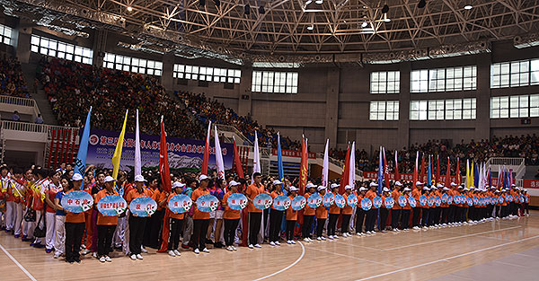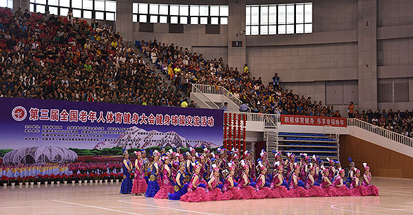 开幕式现场,39支代表队在举着参赛地名字的引导员的带领下,列队站好,现场气氛热烈,场馆座无虚席。开幕式由新疆维吾尔自治区老年人体协常务副主席杨肇季主持。开幕式简洁紧凑,在全体起立,奏唱中华人民共和国国歌后,新疆维吾尔自治区伊犁哈萨克自治州党委常委、奎屯市委书记、奎屯-独山子经济技术开发区党工委书记贾伊生致辞欢迎前来参加交流活动的老年朋友,他说,八月是新疆最美的季节,来自五湖四海的老年朋友汇聚在西部明珠奎屯,共同参加第三届全国老年人体育健身大会健身球操交流活动,这是新疆的荣耀、奎屯的荣耀,是对奎屯市老年体育事业的关注肯定和鼓励鞭策。作为赛事承办方,奎屯将以严谨负责的态度,细致、周到、热情做好各项服务保障工作,让各方满意。