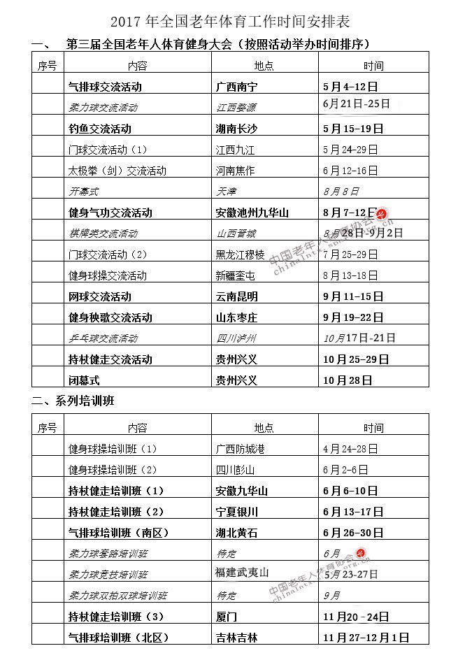 中国老年人体协2017年全国性体育交流活动及培训班计划
